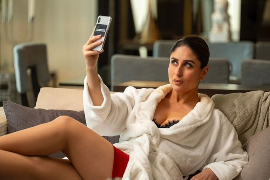 Clad in a white bathrobe, Kareena is seen taking a selfie in between her shots on the sets of Crew. The film entered the 100-crore club globally on its ninth day in theatres.