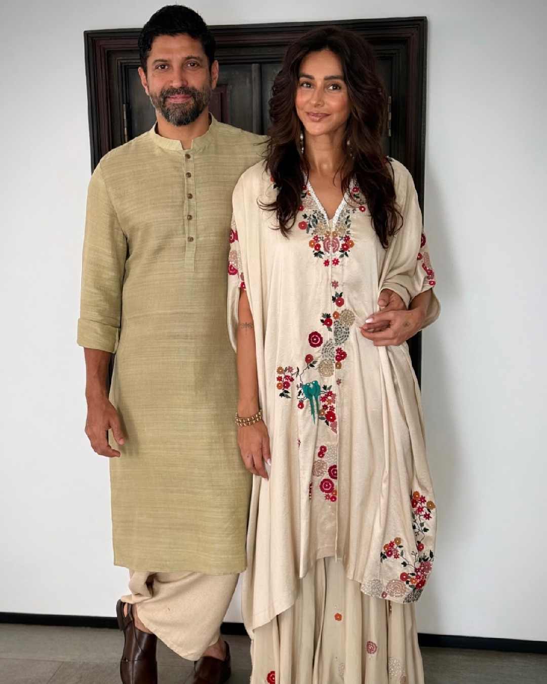 Actor-filmmaker Farhan Akthar posed with wife Shibani Dandekar for a picture. While Farhan sported a green kurta, Shibani looked stunning in a white kaftan set.