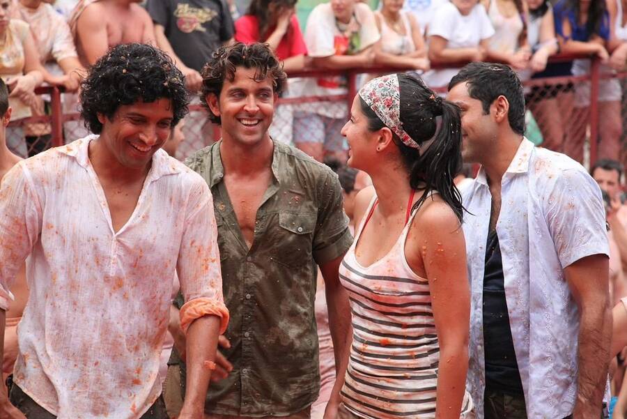 One of the BTS pictures, featuring Hrithik, Abhay, Farhan, and Katrina, provides a glimpse of the iconic La Tomatina sequence from the film.