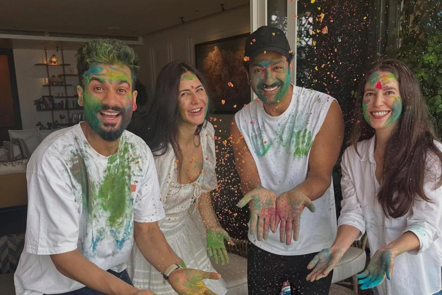 Bollywood power couple Katrina Kaif and Vicky Kaushal celebrated the festival of colours with their family in Mumbai. The couple twinned in white. Vicky’s brother Sunny Kaushal and Katrina’s sister Isabelle Kaif were also present.