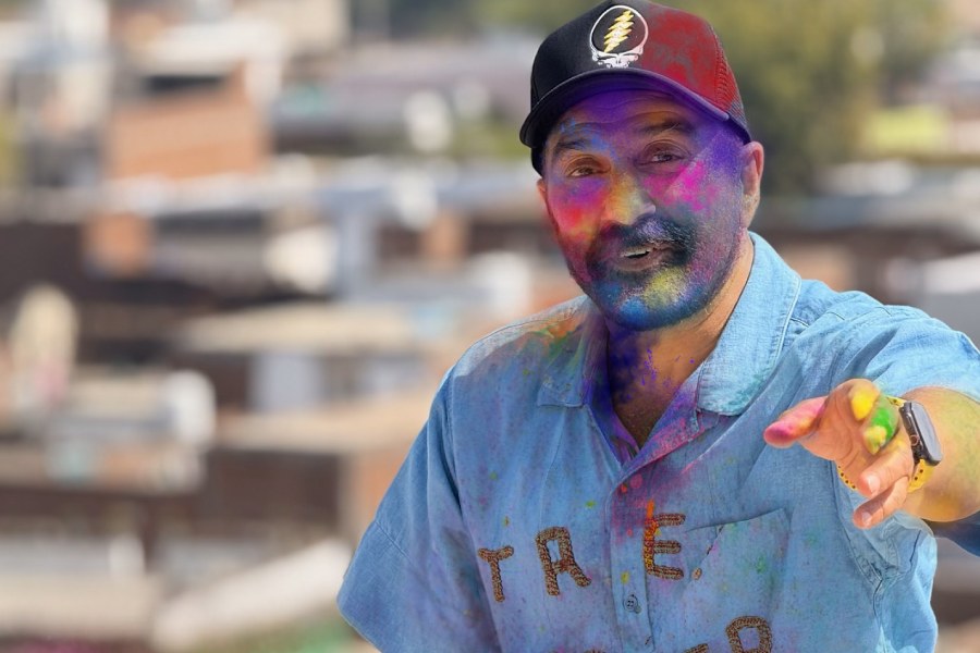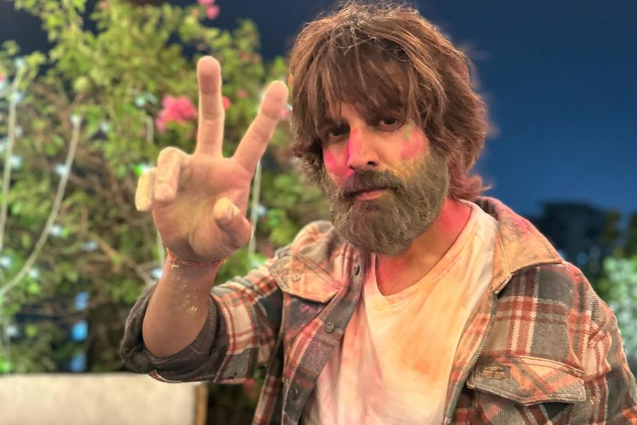 Chandu Champion star Kartik Aaryan looked dapper in his bearded look, with a splash of colors smeared over his face.