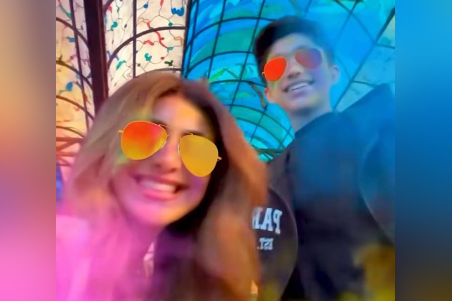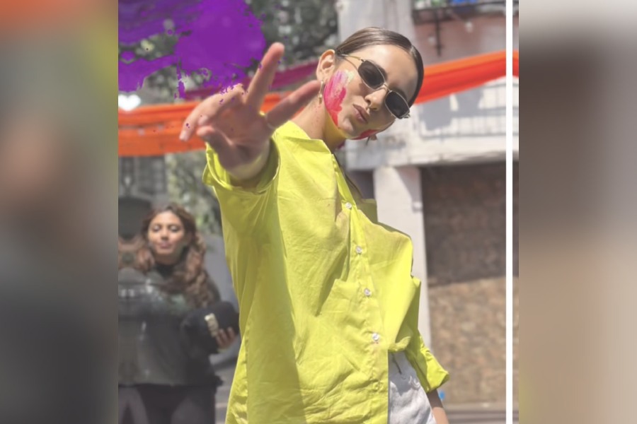 Mere Husband Ki Biwi actress Rakul Preet Singh struck a pose in her shades and lime-yellow shirt. She had pink and red colours smeared on her cheeks.