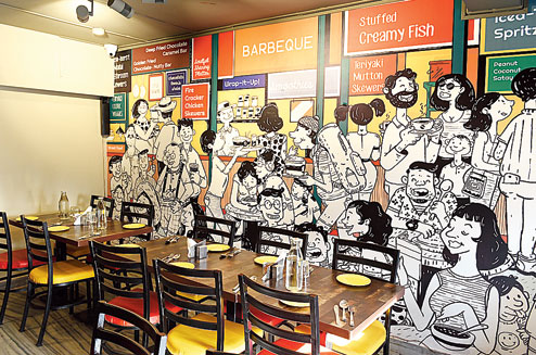 Goan cafes inspire the restaurant’s interior, which is apparent from the wall which features Mario Miranda-esque cartoons. Choose from Meat Lovers Platter to Stuffed Creamy Fish or Malai Mushroom which are some of the best sellers at the eating joint. To make the menu more inclusive, there are also soups, pastas and noodles on offer.
