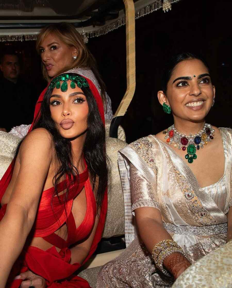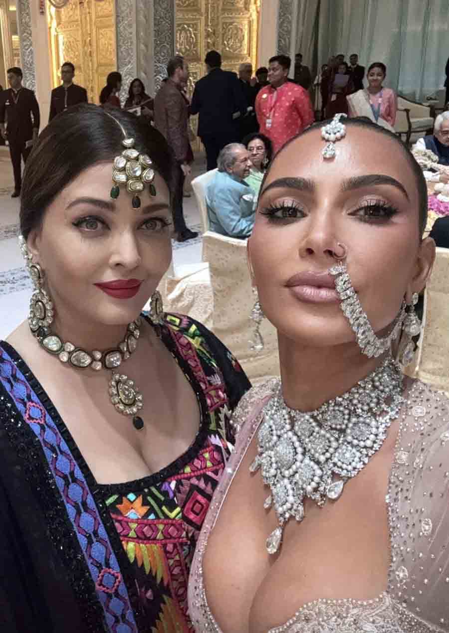 On July 14, Kim shared a selfie with actress Aishwarya Rai Bachchan from the shubh aashirwad ceremony of the Ambanis. While Kim donned a custom sheer saree for the event, Aishwarya wore a black embroidered outfit.