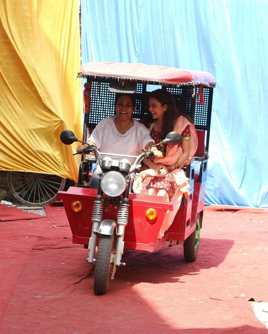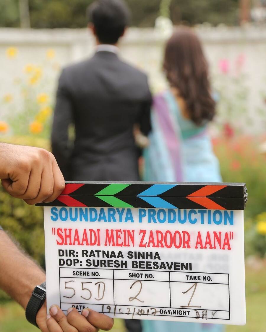 The actors prepared for a shot and a crew member held a clapperboard with Shaadi Mein Zaroor Aana written on it.