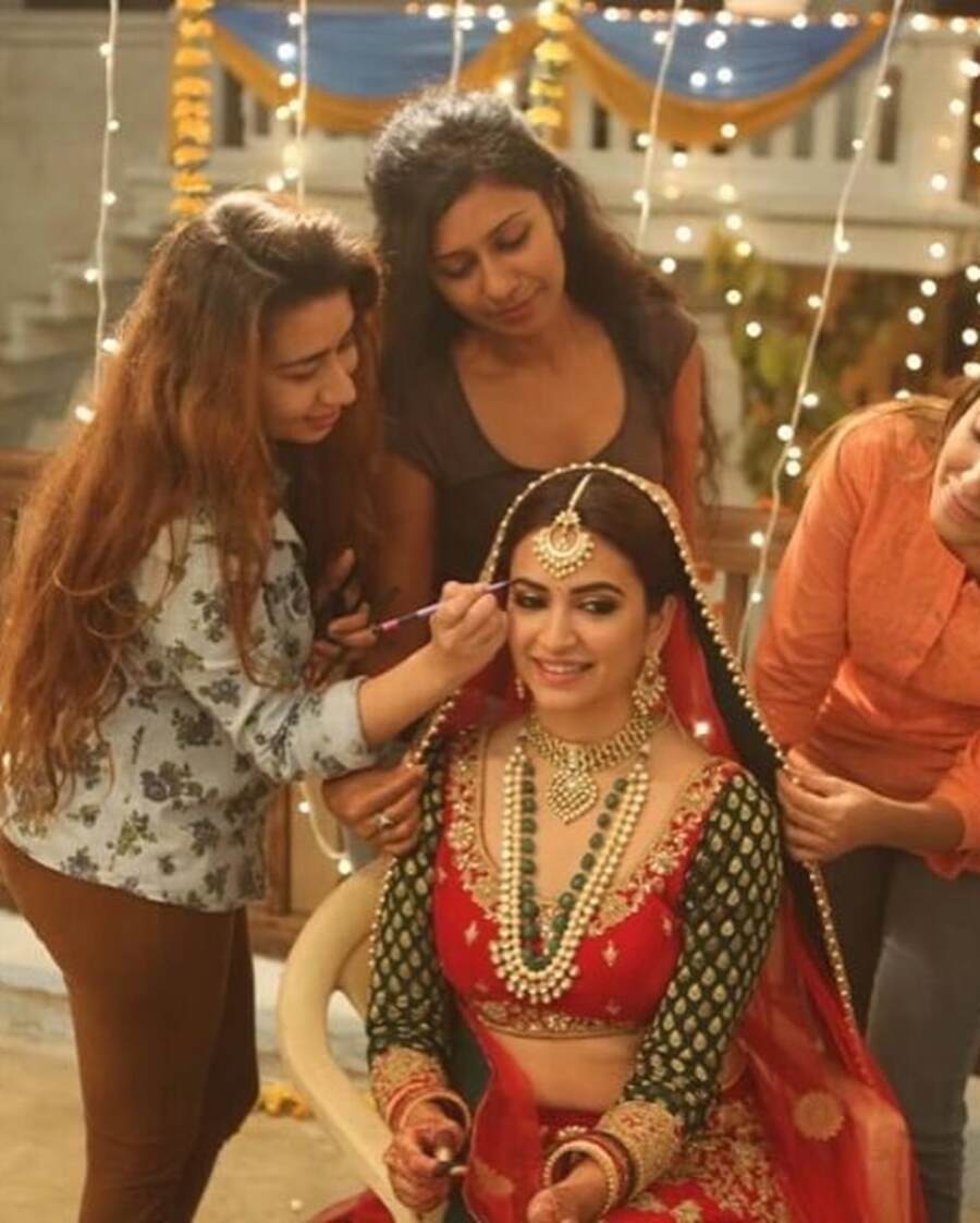 Decked up as a bride in a vibrant red lehenga, Kriti can be seen getting ready with last-minute touch-up before the shot.