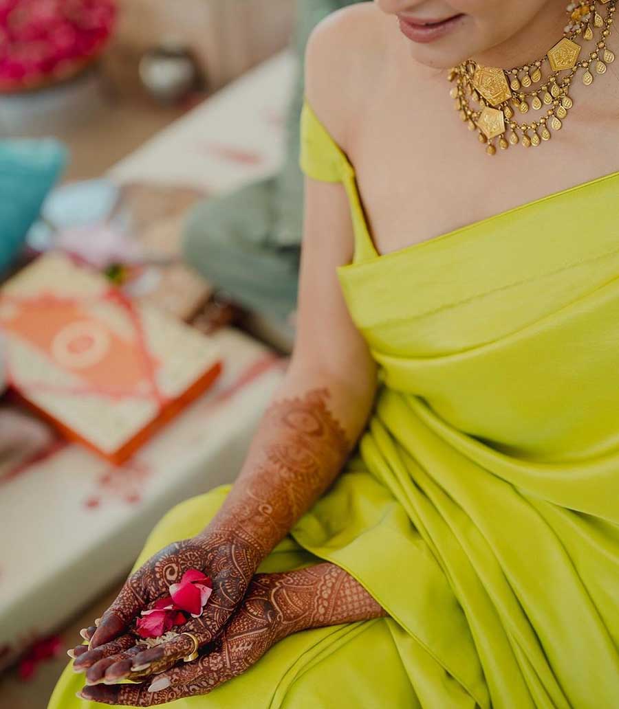The 33-year-old looked gorgeous in a yellow sari, paired with a matching off-shoulder blouse. She opted for nude makeup, while bridal mehendi adorned her arms. “I wish he [Pulkit] was a part of this moment too, but sigh, I loved the look on his face the first time he saw these pictures and was bowled over,” Kriti captioned her post on Instagram.