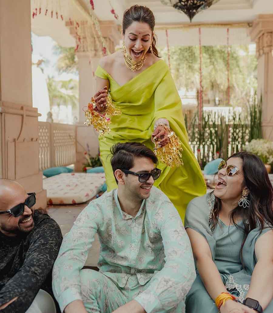 “It was a magical morning. Riding high on emotions and my heart pounding coz Pulkit and I weren’t allowed to meet or see each other before the pheras,” wrote Kriti alongside a picture, which shows her posing for the lens with friends and family at the event.