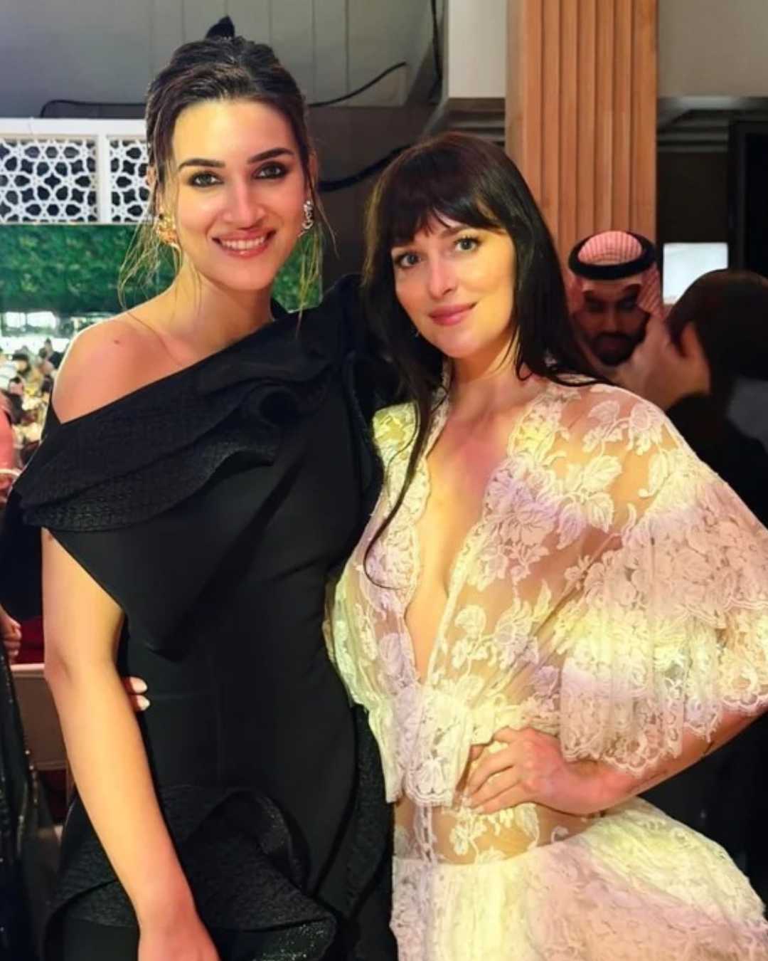 Another Reddit post also shows Kriti posing for a photo with actress Dakota Johnson. While Kriti dazzled in a black, asymmetric, ruffled gown by Australian designer Toni Matičevski, Dakota opted for a bold and white, lacy Chloe gown.