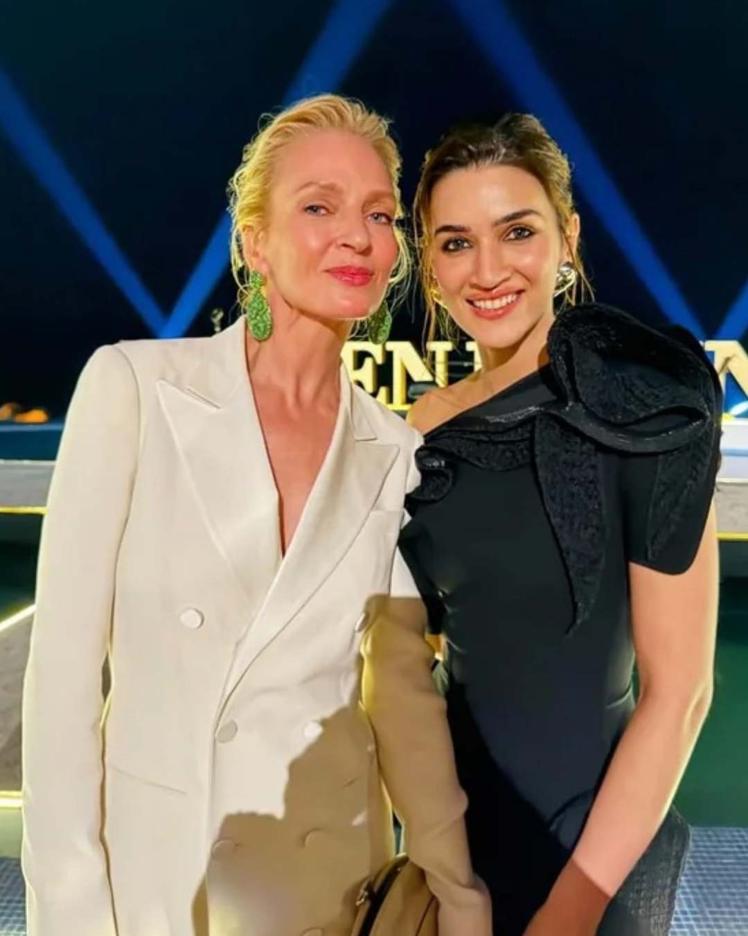 Another picture shows Kriti posing for a photograph with Kill Bill star Uma Thurman. The 55-year-old actress sported a white suit for the film festival.