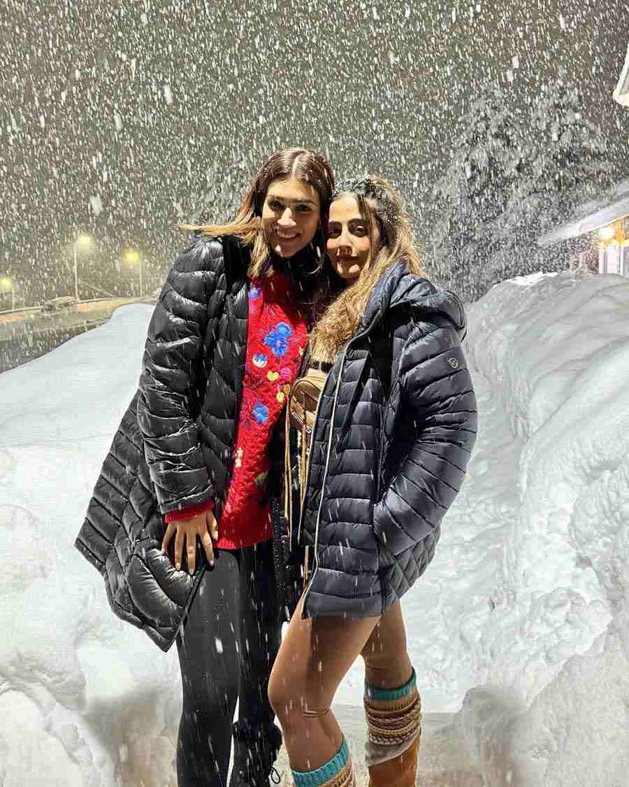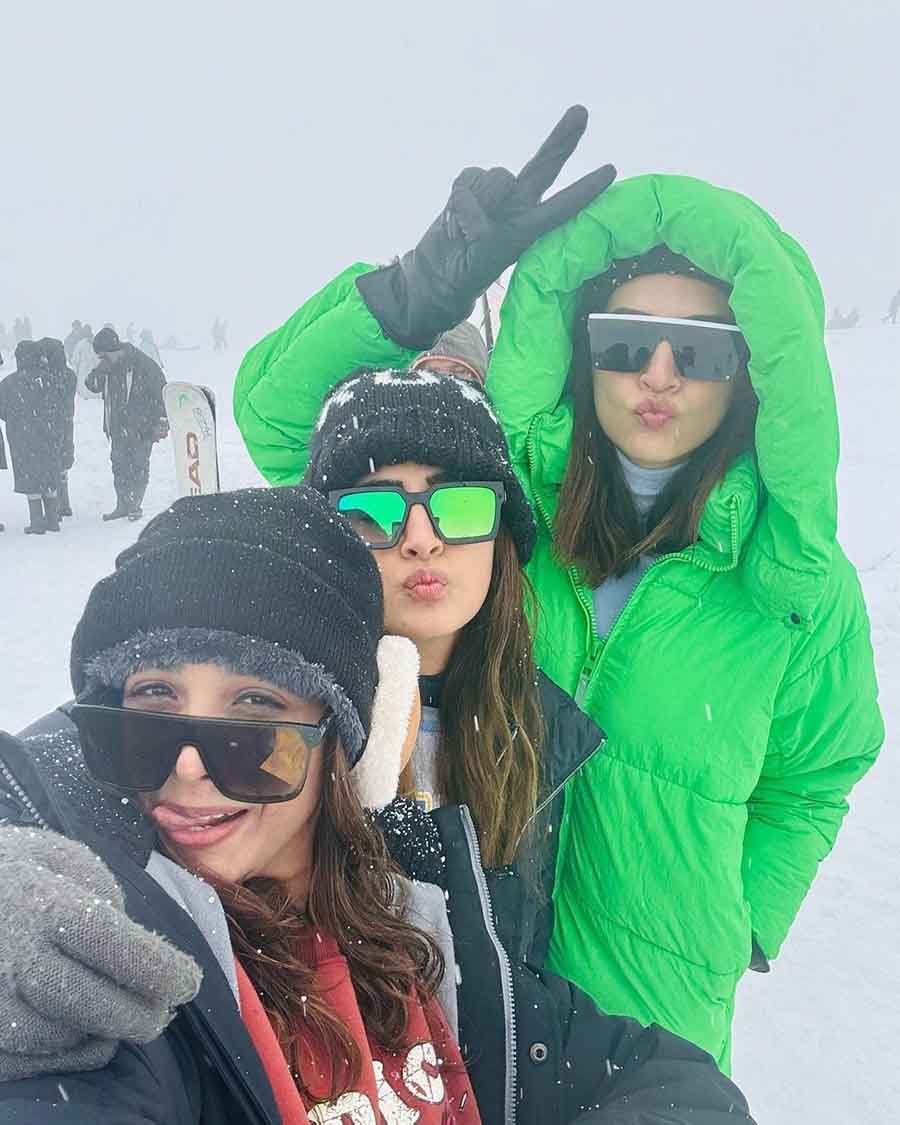 Not letting the snowfall dampen their spirits, the actress huddled up with her friends.
