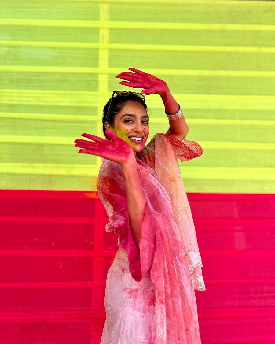 Monkey Man actress Sobhita Dhulipala struck a pose in a white kurta, flaunting the red gulaal stains on her hand.