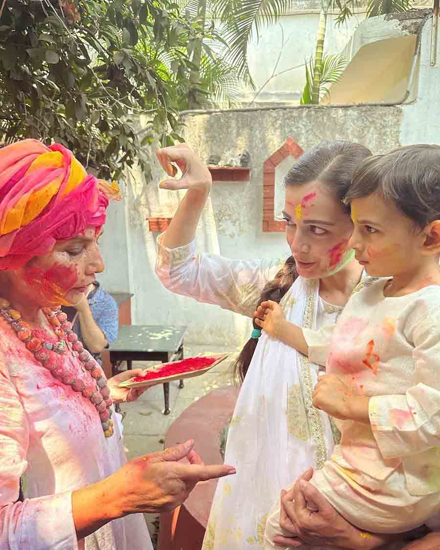 Dia Mirza and her two-year-old son Avyaan Azaad Rekhi were also present at Shibani’s Holi party. The Kaafir actress sported a white salwar suit on the occasion.