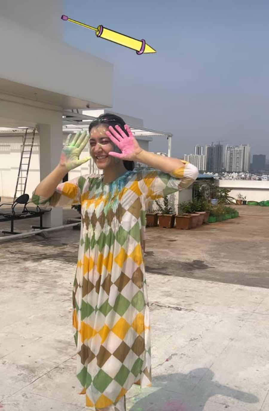 Yodha actress Raashii Khanna posed for a Holi-themed photo on her terrace. Dressed in a white kurta with colourful geometric designs, Raashii showed off her hands smeared with yellow and pink gulaal.