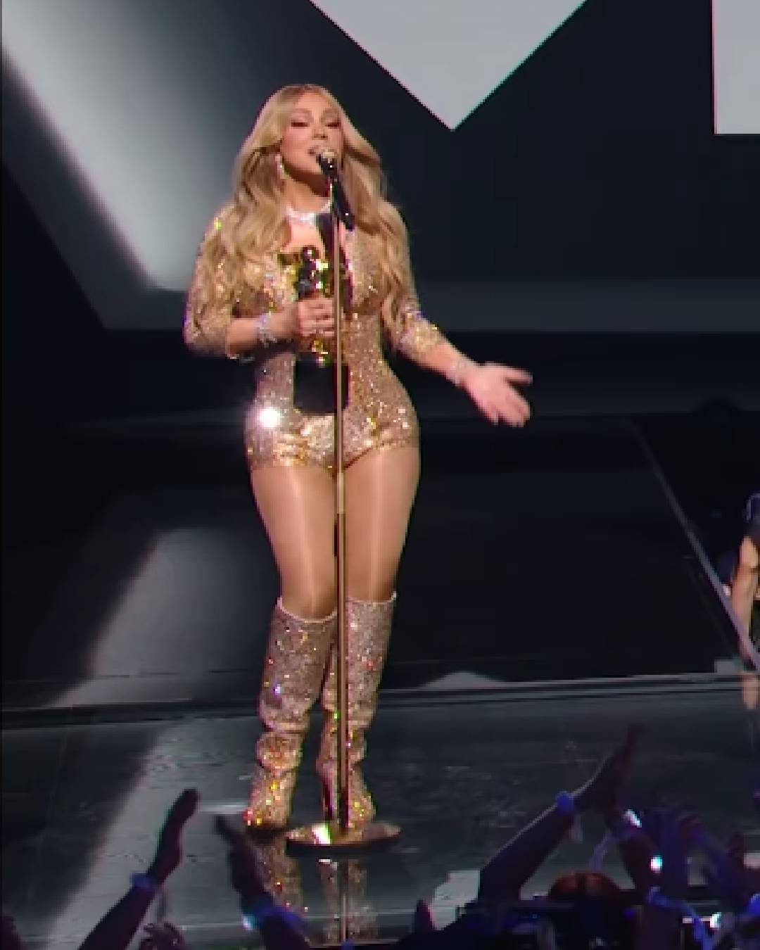 Mariah Carey walked the carpet in a golden sequined bodysuit paired with diamond jewelleries and matching boots.