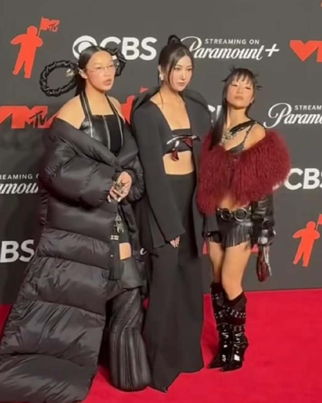 K-pop Demon Hunters cast Audrey Nuna, EJAE and REI AMI twinned in black ensembles.
