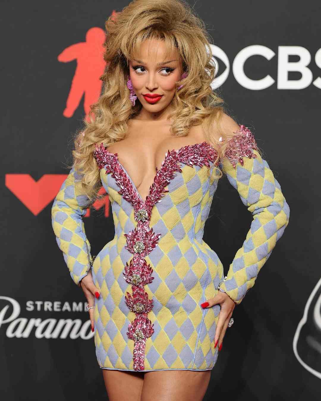 Doja Cat appeared in a mini dress featuring a pastel harlequin pattern with lavender and yellow hues adorned with sparkling embellishments.
