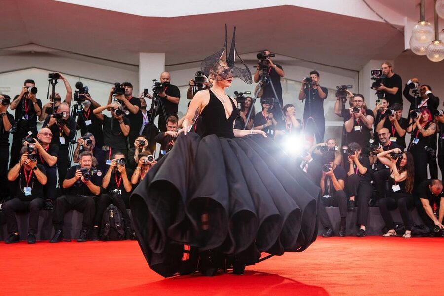 On the red carpet, Lady Gaga donned a face mask with two pointy ears and veiled in Venetian lace. She paired it with a black velvet gown and an elaborate taffeta skirt.