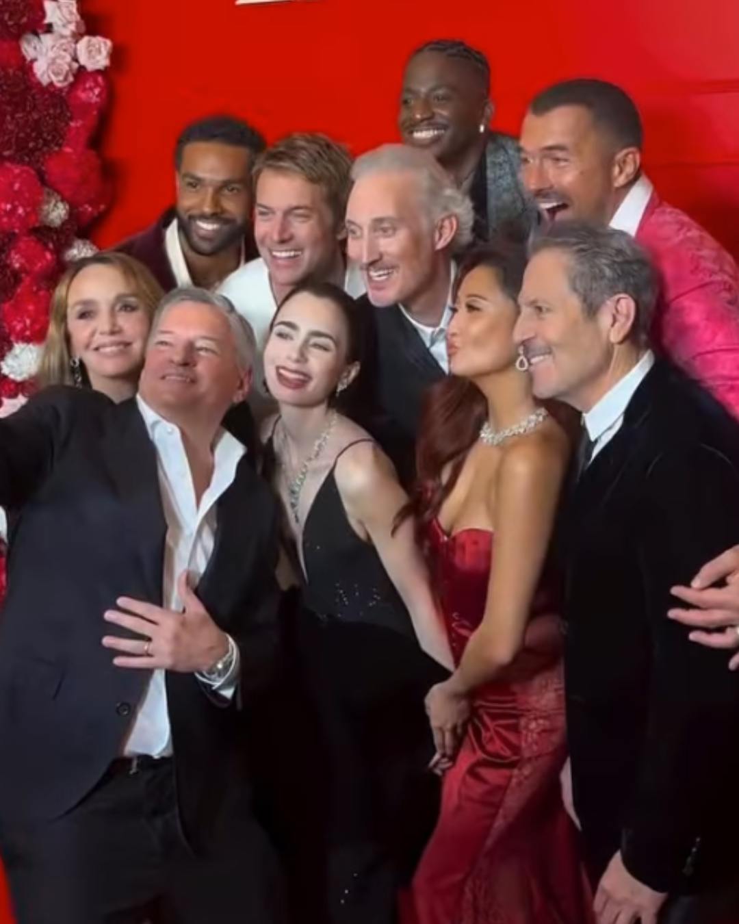 Lily Collins, who plays the lead role of Emily Cooper in the comedy series, posed with co-actors Ashley Park, Lucas Bravo, Bruno Gouery, Camille Razat, Philippine Leroy Beaulieu, and Samuel Arnold, all dressed in their glamorous outfits.