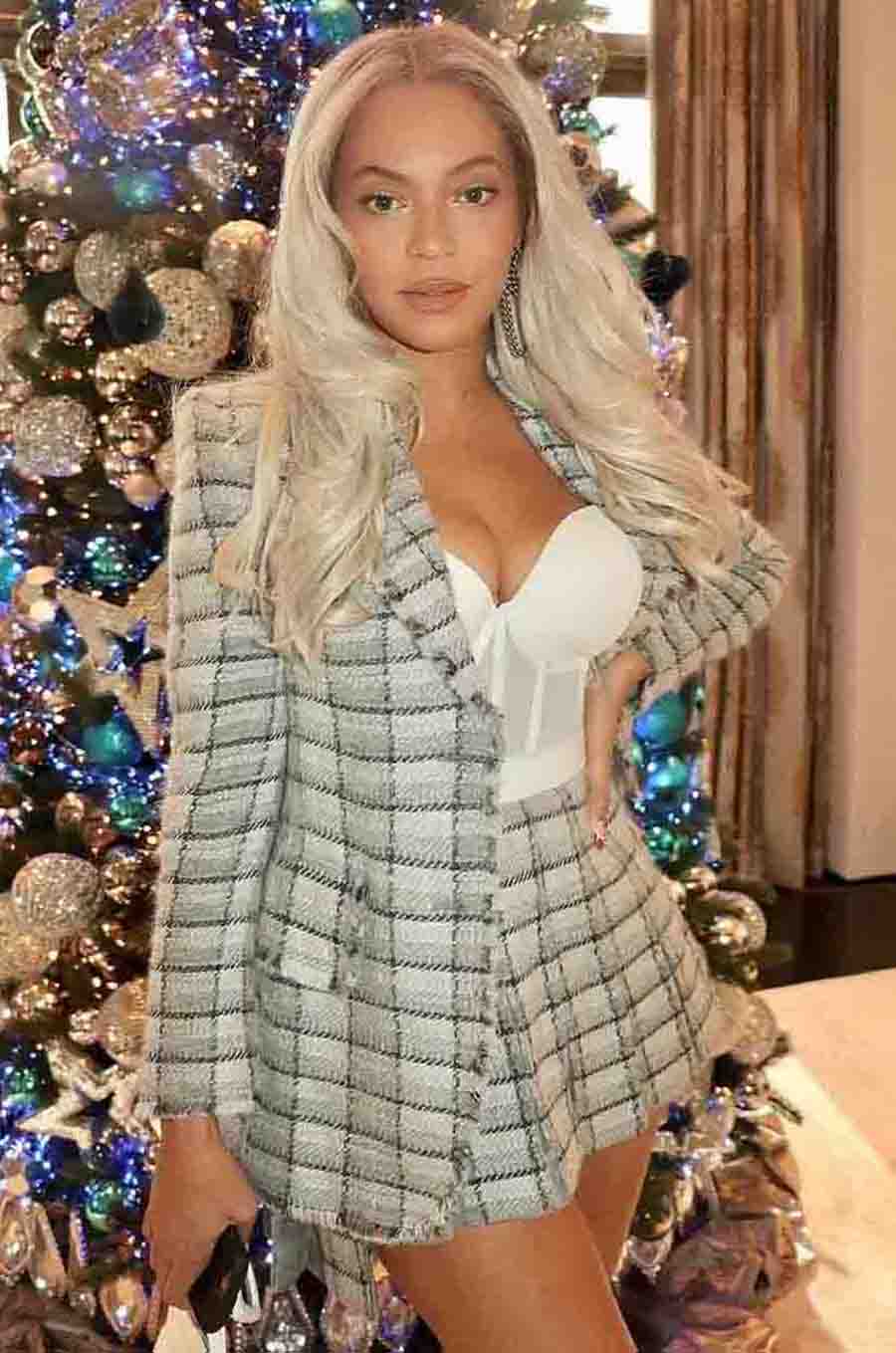Beyonce posed in front of a Christmas Tree, dressed in a white corset, a plaid jacket and skirt ensemble.