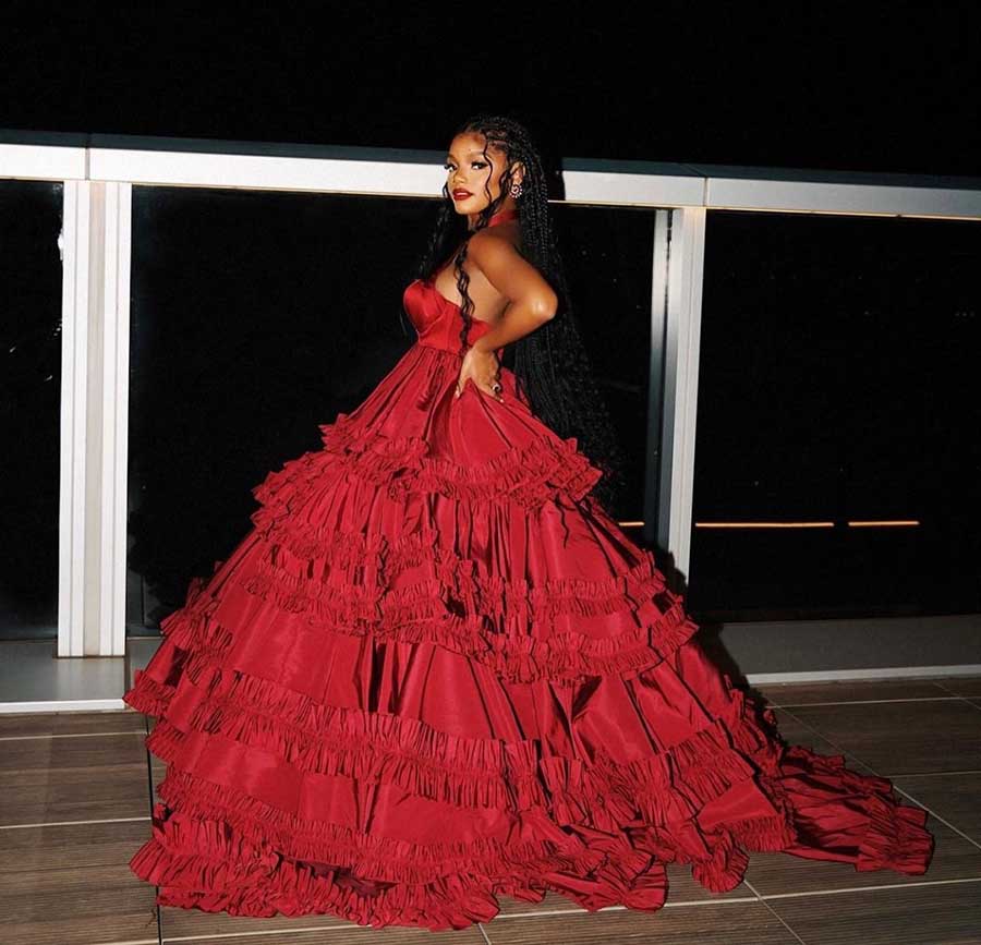 Halle Bailey, who in 2023 played Ariel in the live-action Disney remake of the same name, posed in a flowing red gown with frills.