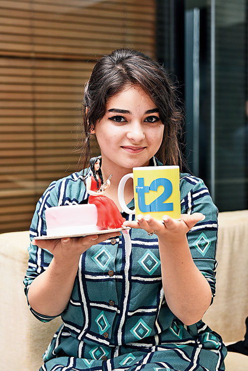 Zaira Wasim is unlike any 16-year-old we’ve met. Pretty and poised, the teenager has a very calm and composed air about her — “philosophical” is how she described herself to t2 during this chat. But for a moment the Kashmiri girl, who shot into the spotlight with her award-winning act as the younger Geeta Phogat in the biggest blockbuster in Indian cinema history, Dangal, became like just another 16-year-old. That was when she walked into the sixth floor lounge at Novotel Hotel and Residences last Sunday… and spotted herself on not one, but two cakes that t2 had brought for her!