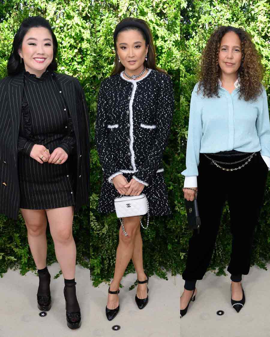 (L-R) Chinese-American actress Sherry Cola showed up in a black pinstripe dress with a long matching blazer on top. Emily in Paris star Ashley Park wore a classy black-and-white skirt-and-blazer set with white accents, completing her look with a white Chanel handbag. The Woman King director Gina Prince-Bythewood sported a power blue top with black pants.