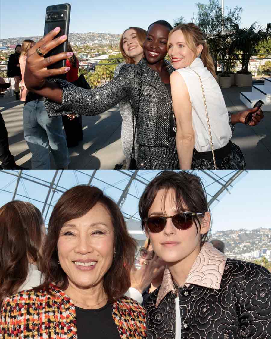 (Top) Lupita flanked by mother-daughter duo Leslie Mann and Maude Apatow. (Bottom) Academy President Janet Yang with Kristen Stewart in a floral-patterned blazer.