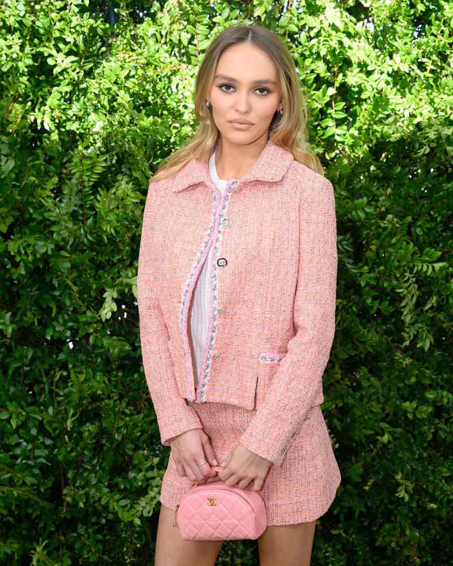 Lily Rose-Depp stood out in a peach skirt and blazer outfit, complete with a small peach Chanel handbag.