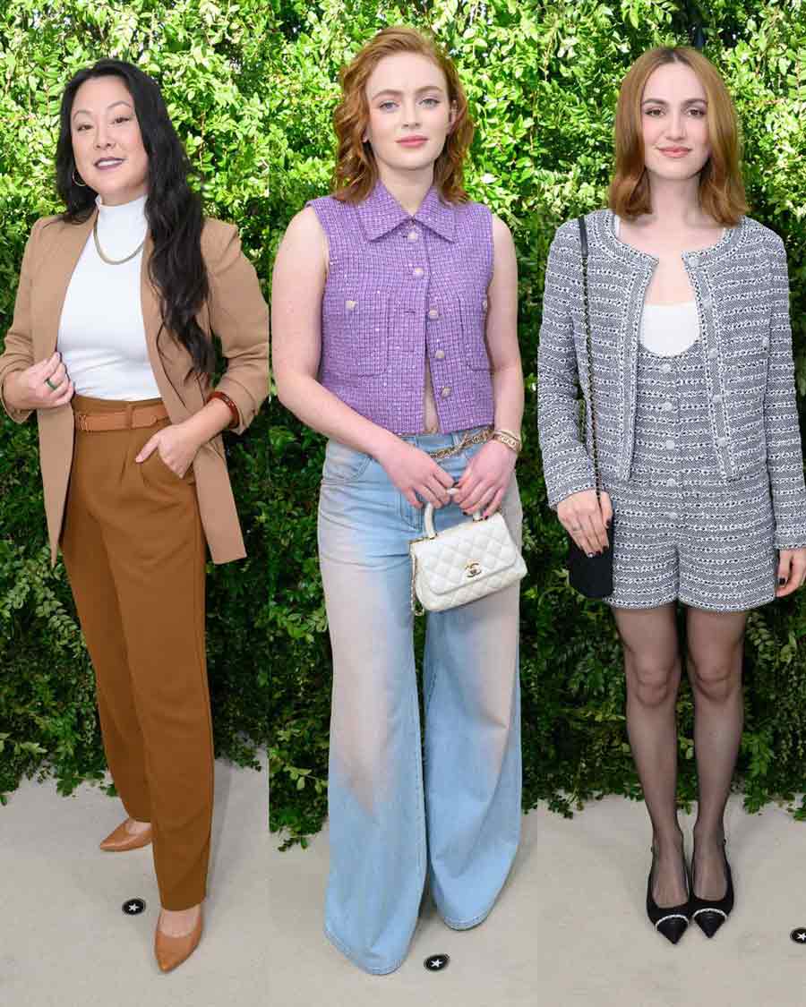 (L-R) Erica Eng paired her brown pants with a beige blazer and a high neck white top. The Whale star Sadie Sink wore faded flared denim pants with a lavender top. Maude Apatow, who stars in This is 40, wore a grey-and-white tweed set.