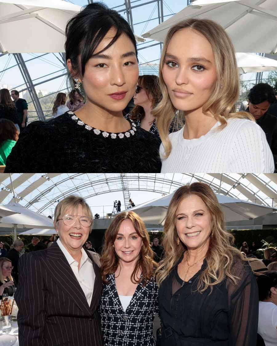 (Top) Greta Lee and Lily Rose-Depp posed together. (Bottom) Annette Bening, Kristie Macosko Krieger and Rita Wilson dressed in black and white.