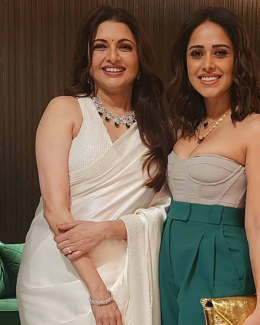 Nushrratt, known for movies like Pyaar Ka Punchnama 2 (2015), Sonu Ke Titu Ki Sweety (2018), Dream Girl (2019), (2022), Ram Setu (2022) and Chatrapathi (2023), donned an off-white-and-turquoise ensemble on the occasion. The blouse, featuring a corset fit, was tucked into A-line palazzos. Golden accessories and a golden clutch accentuated the actress’ look.