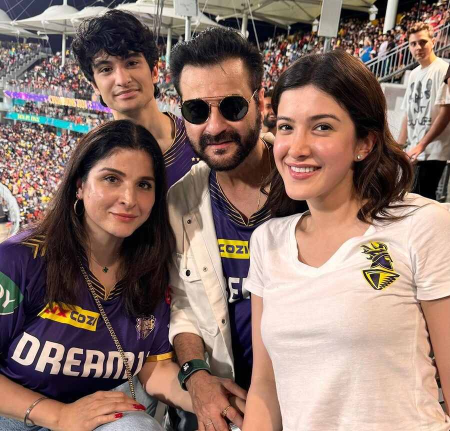 For the match, Sanjay sported a white jacket over a purple jersey to twin with his daughter Shanaya. His son Jahaan and wife Maheep also shared the frame.