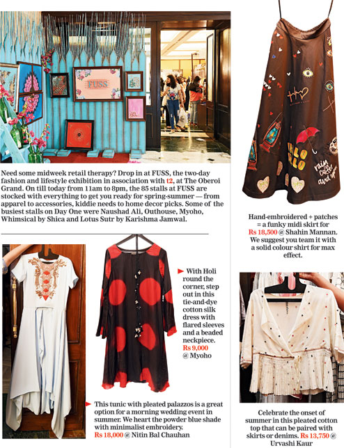Need some midweek retail therapy? Drop in at Fuss, the two-day fashion and lifestyle exhibition in association with t2, at The Oberoi Grand. On till today from 11am to 8pm, the 85 stalls at FUSS are stocked with everything to get you ready for spring-summer — from apparel to accessories, kiddie needs to home decor picks. Some of the busiest stalls on Day One were Naushad Ali, Outhouse, Myoho, Whimsical by Shica and Lotus Sutr by Karishma Jamwal.