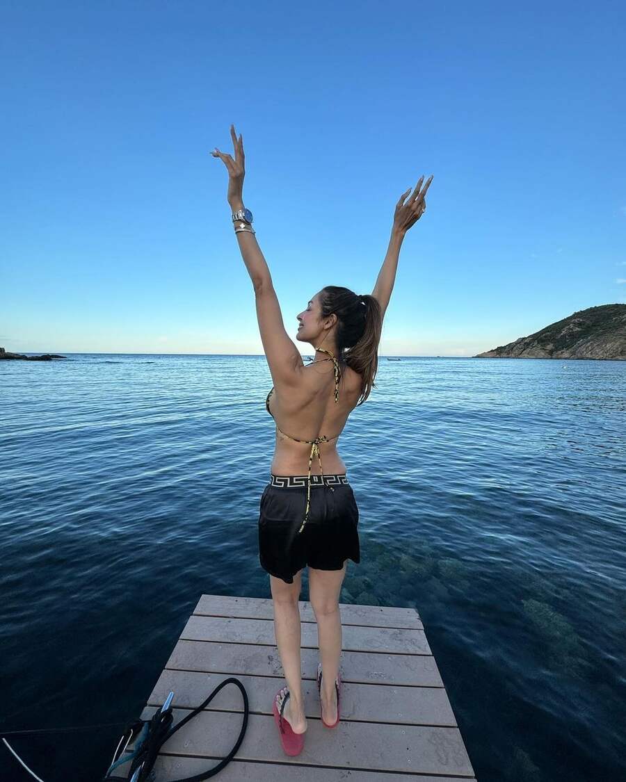 Malaika Arora made the mercury soar in a bathing suit as she looked ready to dive into the ocean from a wooden platform.
