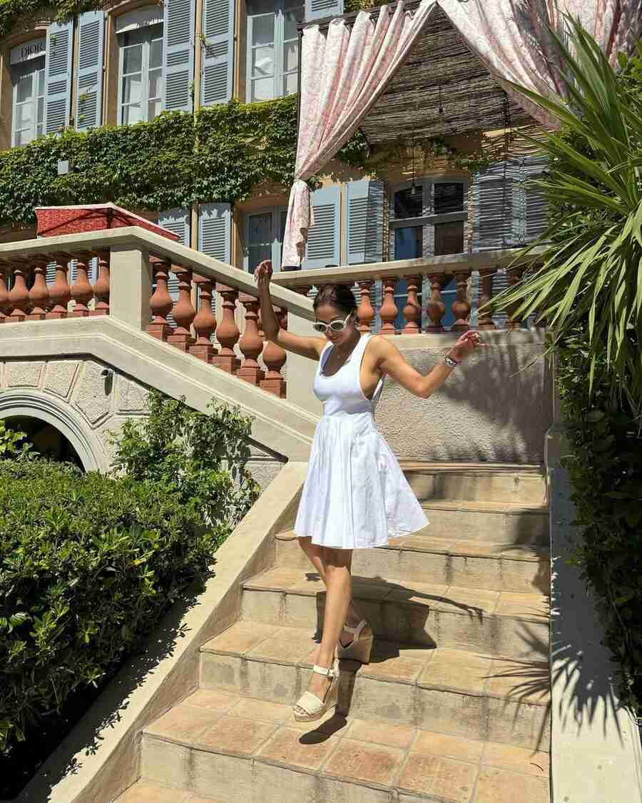 Malaika paired her white dress with wedge heels as she stood on the outdoor stairs of an ivy-walled building.