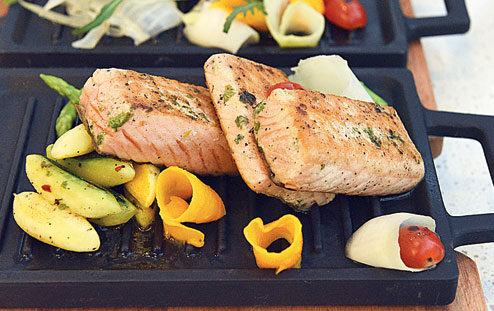 Pan-seared Salmon with Holy Basil and Mango Salsa: A no-muss, no-fuss dish. Meaty fillets of pan-seared salmon is flavoured with basil, a bit of pesto and served with fenugreek leaves, rocket leaves and ribbons of Lyangra mango. “The flavours are very basic because salmon itself is very flavourful. The Lyangra adds a nice sourness,” said chef Saha.