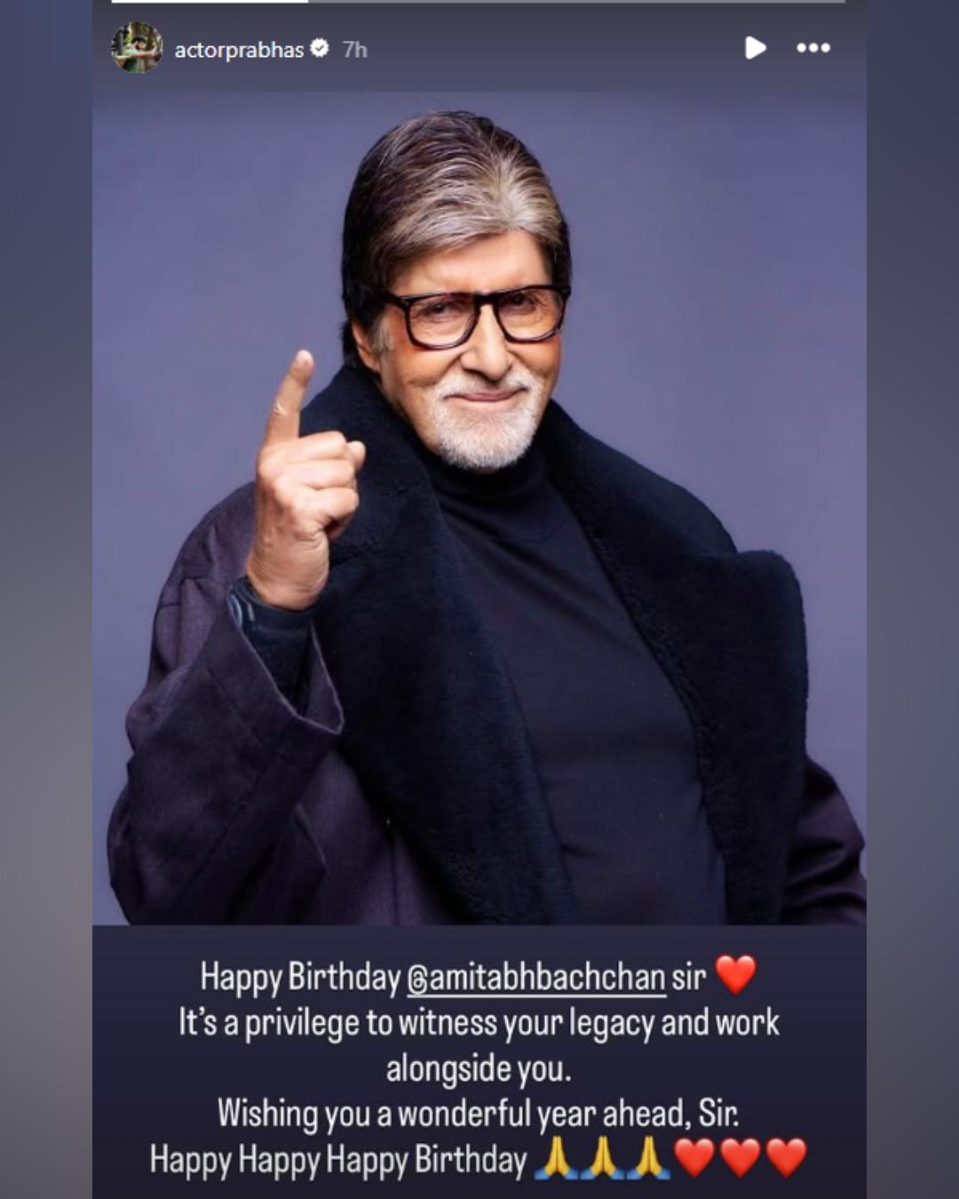 Prabhas, who acted alongside Bachchan in Kalki 2898 AD, took to Instagram stories to wish the veteran actor. “Happy birthday @amitabhbachchan sir. It's a privilege to witness your legacy and work alongside you.”