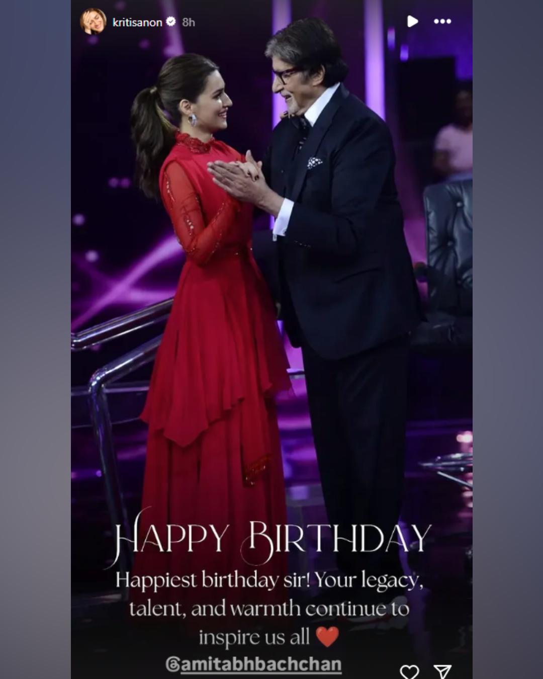 Sharing a picture from the sets of Kaun Banega Crorepati, actress Kriti Sanon wrote, “Happiest birthday, sir! Your legacy, talent and warmth continue to inspire us all.”