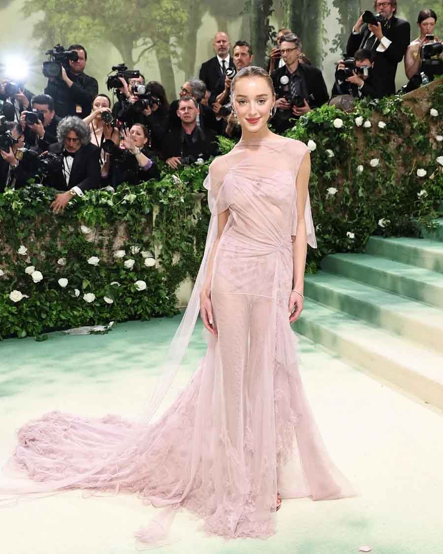 Phoebe Dynevor, who plays Duchess Daphne Basset in the Regency-era drama series, appeared in a custom Victoria Beckham dress, an intricate pink backless lace gown featuring hand-cut flowers and a floor-grazing train. A sleek bun, minimal accessories and nude lips accentuated her ensemble.