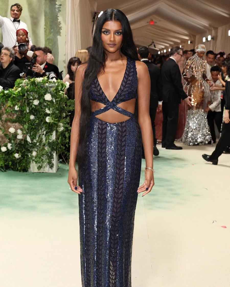 Simone Ashley, known for her portrayal of Kate Bridgerton, dazzled in a blue shimmery cut-out gown by Prabal Gurung. The 29-year-old actress flaunted her long tresses and opted for smoky eyes and matching press-on nails to round off her look.