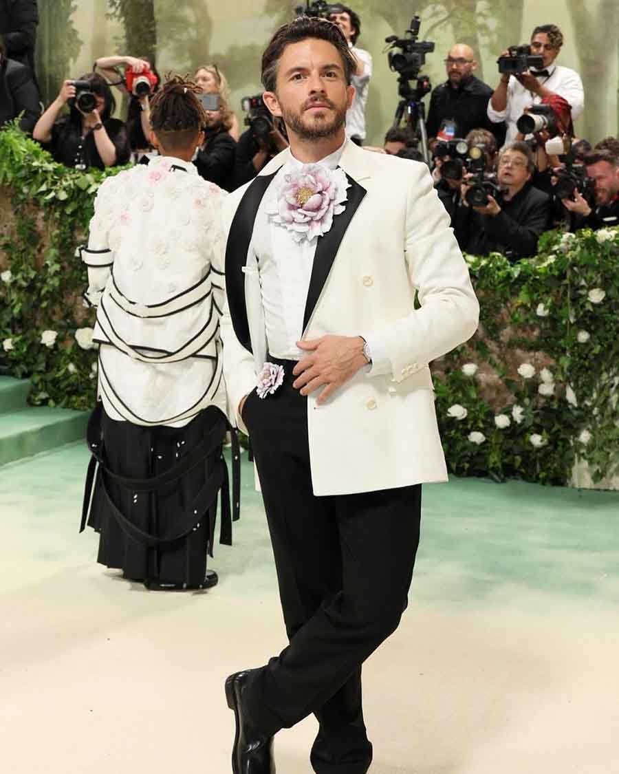 Jonathan Bailey, set to reprise his role as Anthony Bridgerton in the upcoming third instalment of the period drama series, stole the show in a Loewe tuxedo. Three-dimensional flowers adorned the crisp collars of his white shirt and the beltline of his black chinos, aligning with this year's Garden of Time dress code at Met Gala.