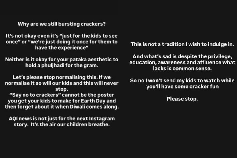 “Why are we still bursting crackers? It’s not okay even if it’s ‘just for the kids to see once’ or ‘we’re just doing it once for them to have the experience.’ Neither is it okay for your pataka aesthetic to hold a phuljhadi for the gram. Let’s please stop normalising this,” she wrote.