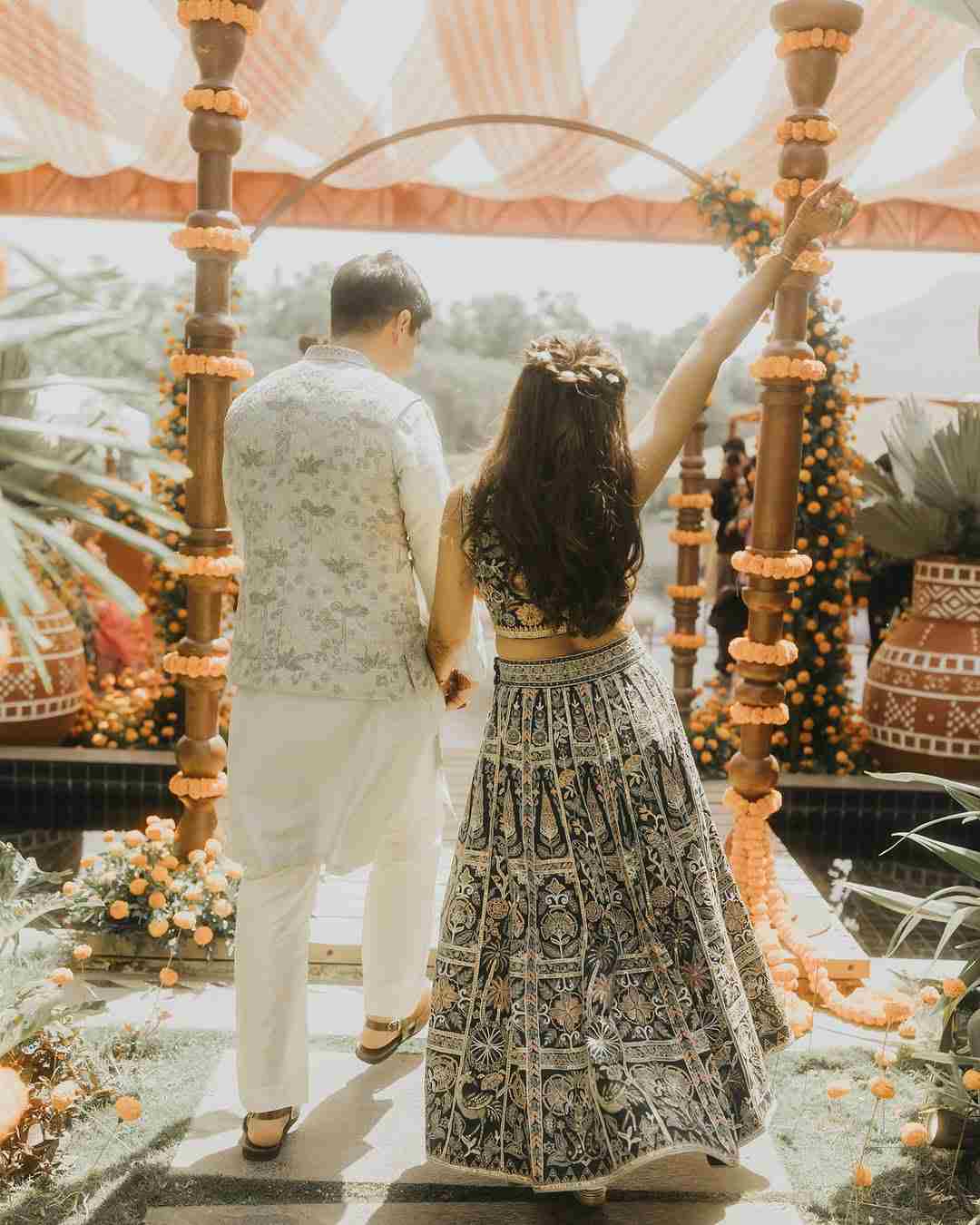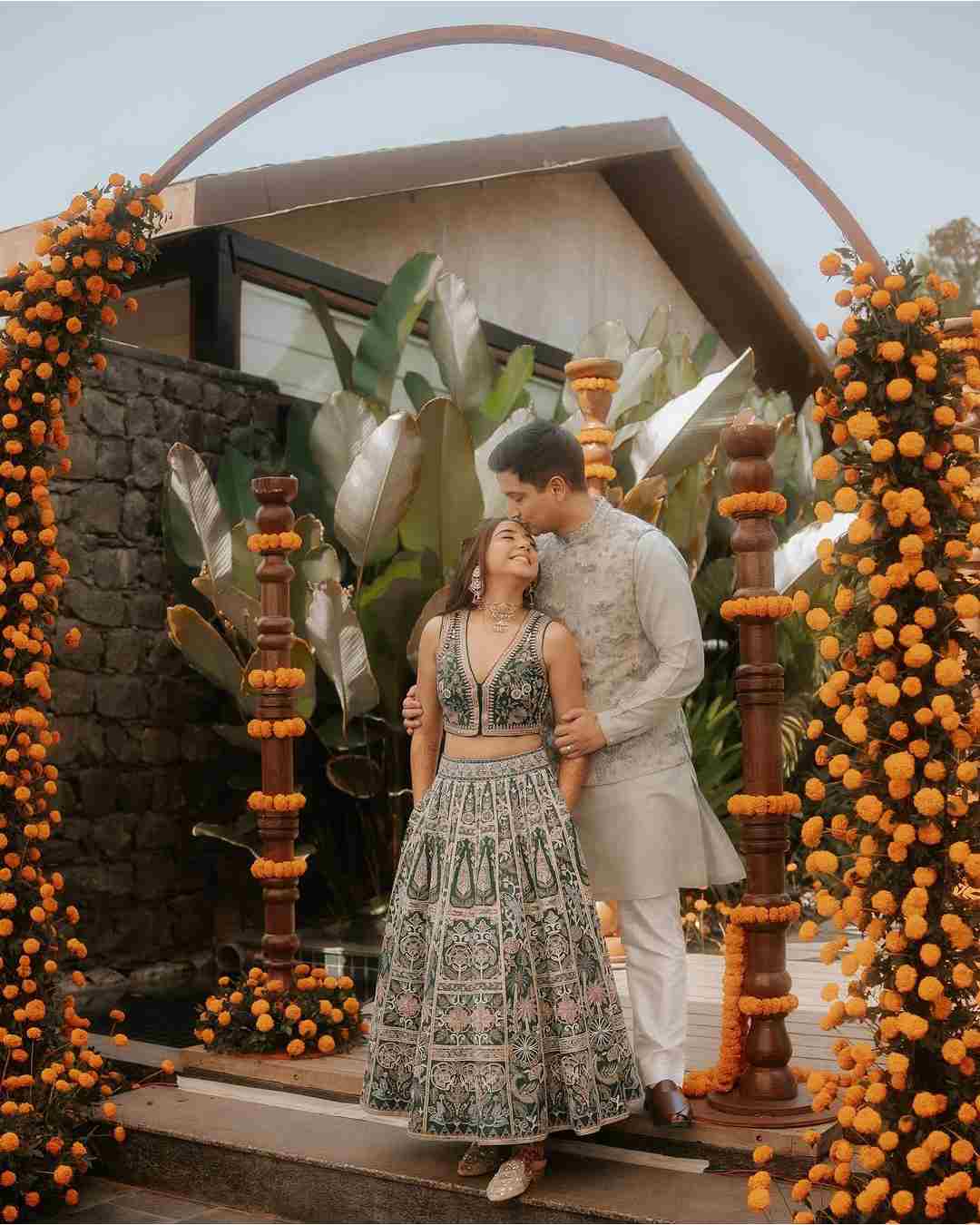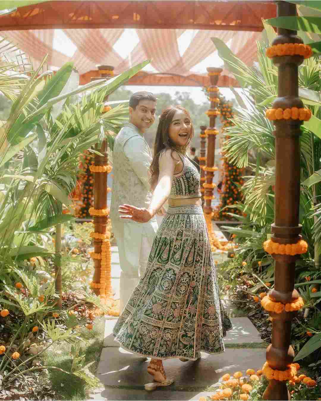 Prajakta looked stunning in a dark green embroidered lehenga, while Vrishank complemented her in a mint-green kurta, paired with a printed Nehru coat.