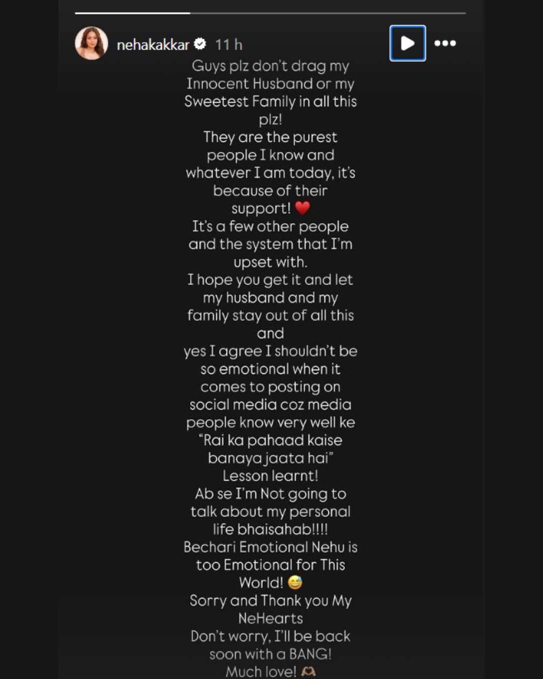 “It's a few other people and the system that I'm upset with. I hope you get it and let my husband and my family stay out of all this and yes I agree I shouldn't be so emotional when it comes to posting on social media coz (because) media people know very well ke "Rai ka pahaad kaise banaya jaata hai” (mountain out of a molehill). Lesson learnt,” she continued, adding that she will soon make a comeback.