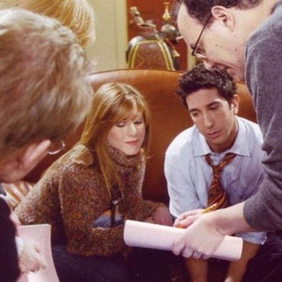 Aniston and David Schwimmer (Ross Geller) taking notes during the shoot.