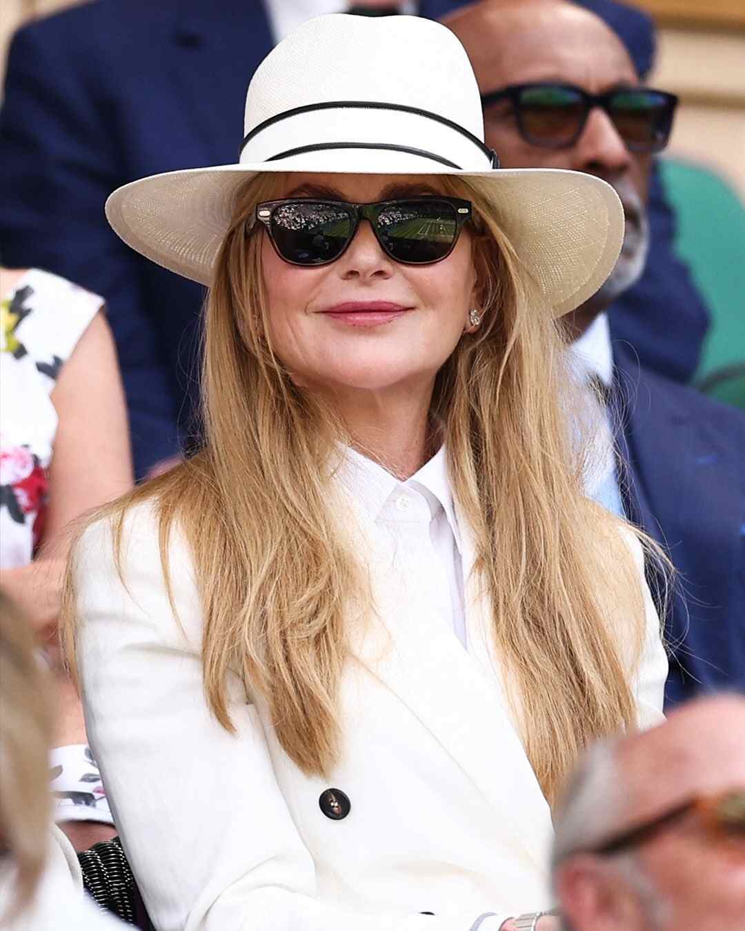 Nicole Kidman looked elegant in an all-white ensemble — a double breasted blazer worn over a shirt paired with a wide-brim sun hat.