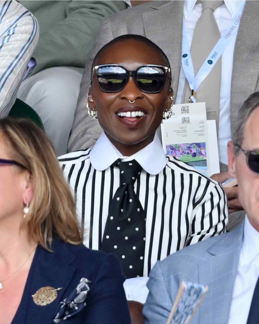 Wicked actress Cynthia Erivo looked chic in a black-and-white striped shirt. She complemented it with a monochrome polka dot tie.