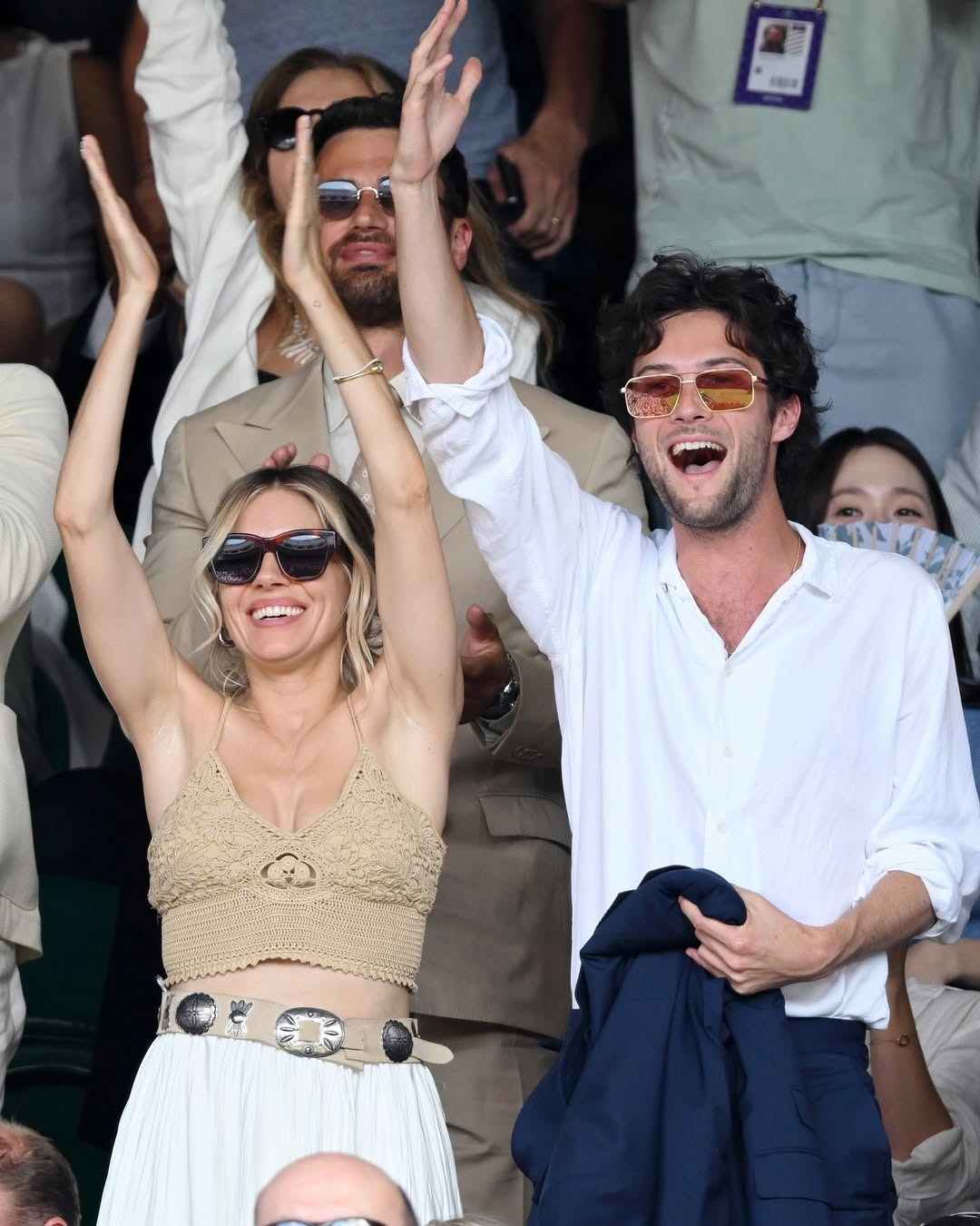 Sienna Miller cheered from the stands, raising her hands and smiling at the camera.