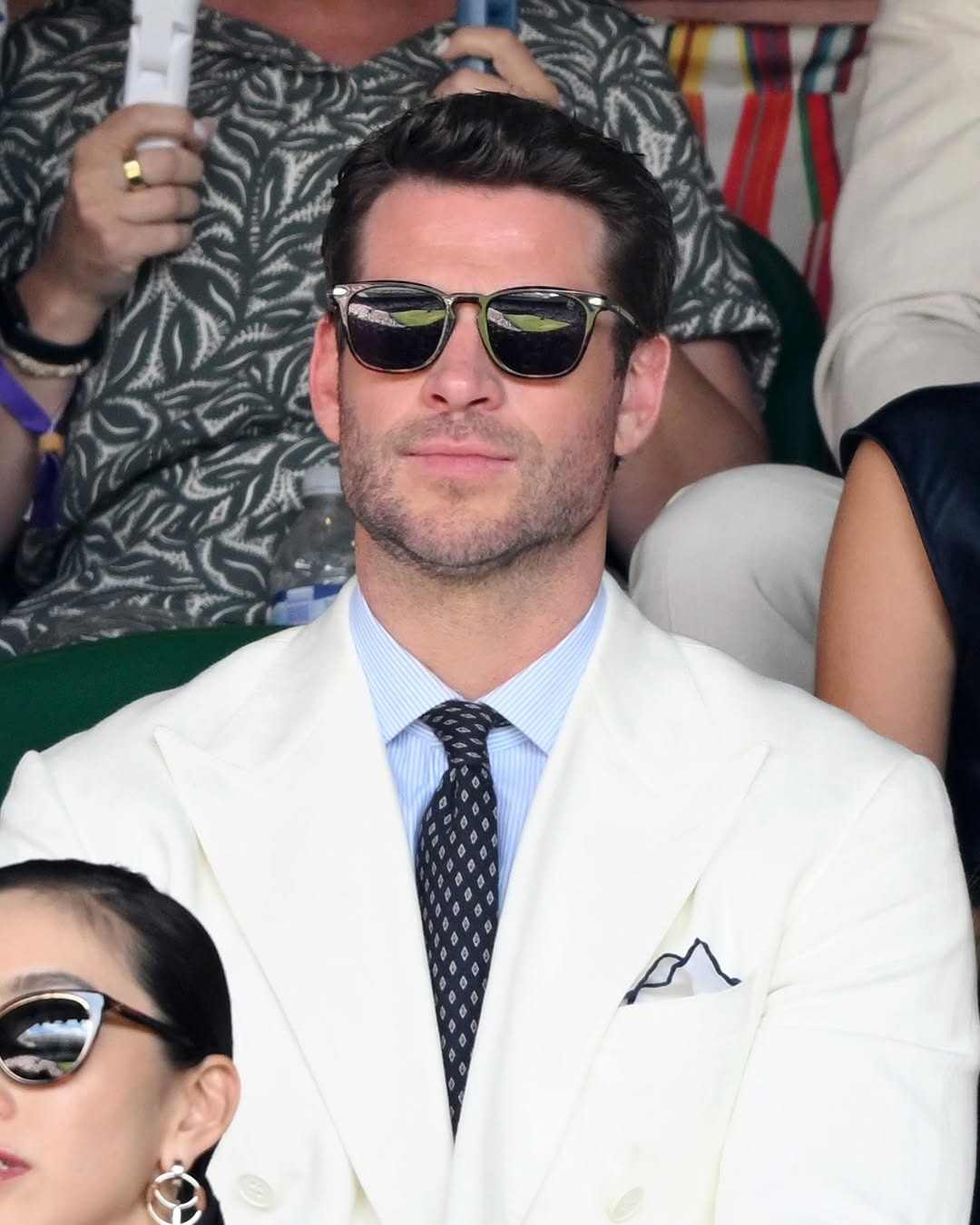 Liam Hemsworth looked suave in a crisp white suit at the Wimbledon men’s singles championship.